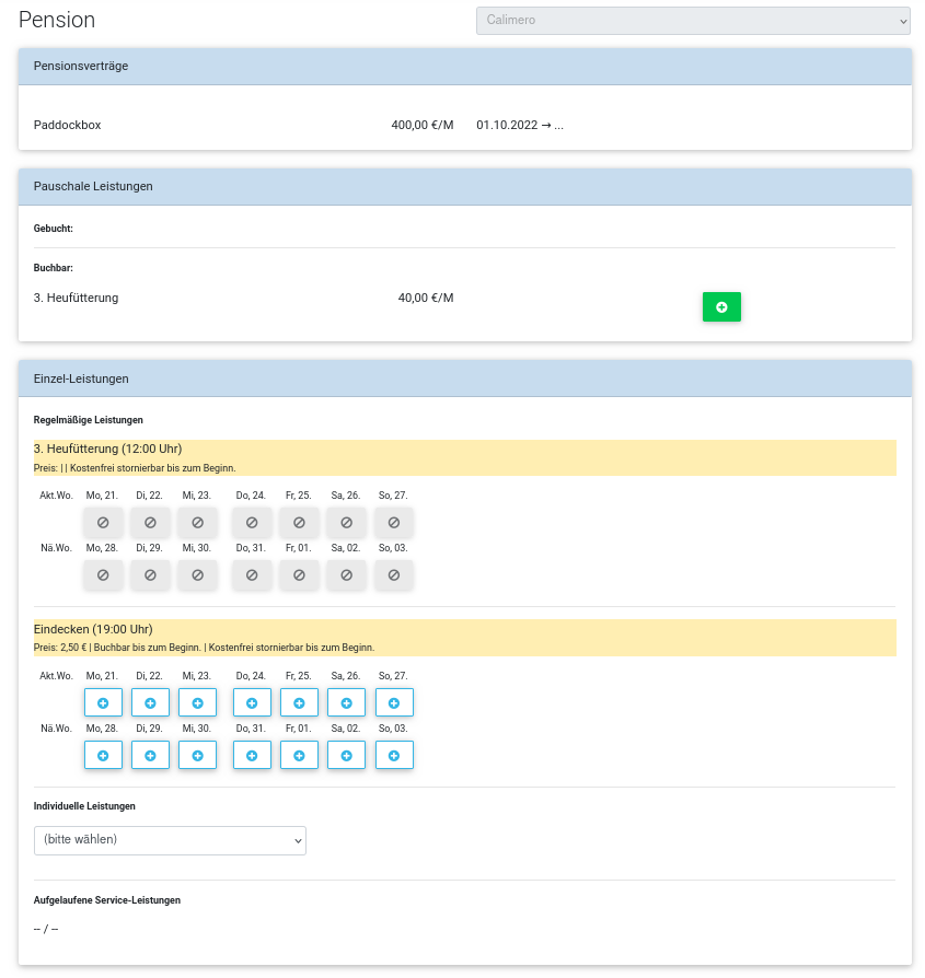 - Leistungen nach Aufwand (Kartentyp P:Einzel): in dieser Sammel-Position werden einzelne Leistungen, wie z. B. das Bringen in die Führanlage oder die Gabe von Medikamenten, zusammengefasst und auf der nächsten Rechnung platziert, so dass auch solche Leistungen papierlos dokumentiert und abgerechnet werden können.