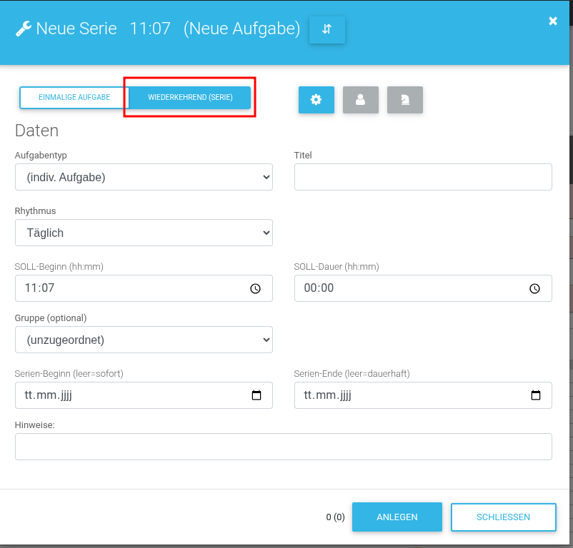 öffnen Sie das Dialogfenster zum Erstellen einer Aufgaben(serie). Wählen Sie oben nach Bedarf EINMALIGE AUFGABE oder WIEDERKEHREND (SERIE) aus. Im Screenshot sehen Sie das Fenster zum Erstellen einer Aufgabenserie.